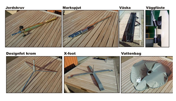 Finns i flera olika storlekar. Mast och väska ingår. Kryssfot eller markskruv ingår ej.