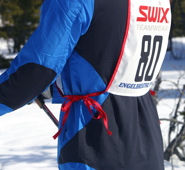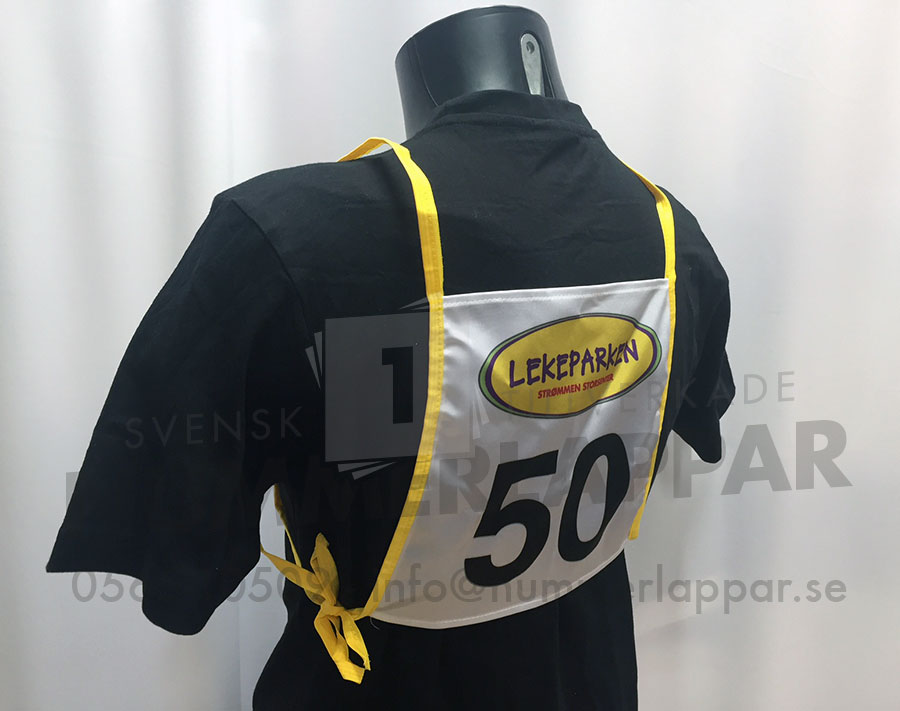 Sydd dubbelsidig nummerlapp med färgade kantband och knytning i sidorna. Du väljer själv färg på kantbanden.