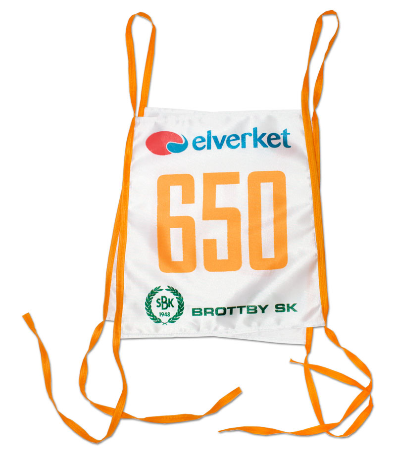 Polyestertyget återger tryck mycket bra, så nummerlappen kan designas precis som du vill. Bakgrundsfärg, toningar/gradients och detaljrika loggor i fyrfärg är inga problem på denna nummerlapp.
