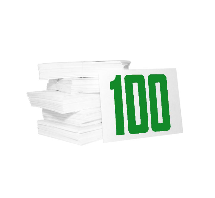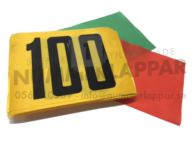 Svarta siffror på gul, grön och orange botten. Säljs i buntar om 100st, Ex. 1-100.