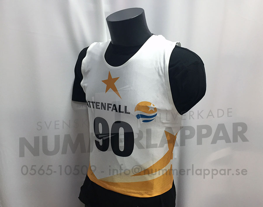 Västarna trycks med obegränsat antal färger. Polyestertyget återger tryck mycket bra så nummerlappen kan designas precis som du vill.